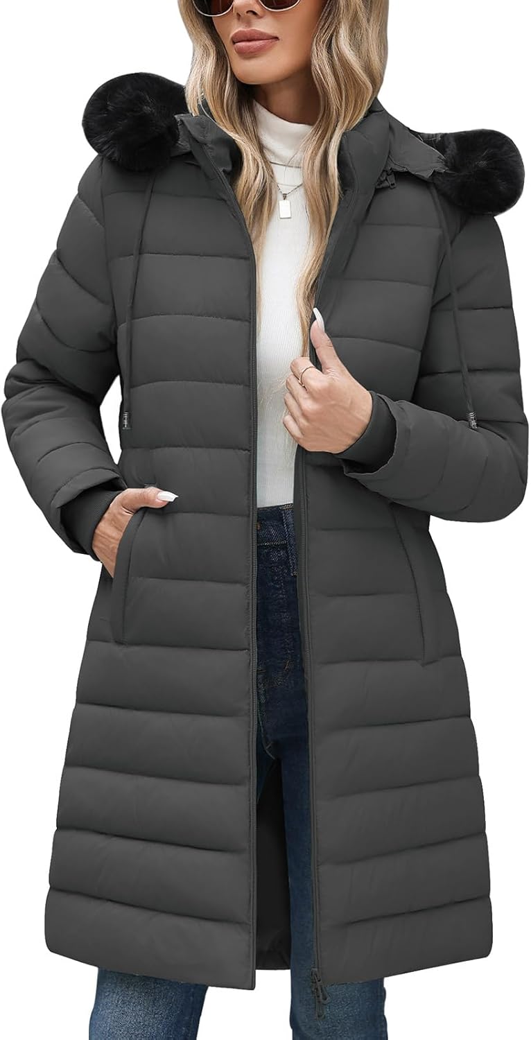 - Design: This ladies long winter coat boasts a stylish slim-fit that hugs your waist, so you still look stunning even when you’re bundled up! The detachable hood includes a black faux fur trim and an adjustable Velcro strap for a customizable fit, trim gives additional warmth and protection for your head, neck, and ears. This versatile and comfortable long puffer coat women is puffy and soft, adding an extra touch of elegance to your overall look