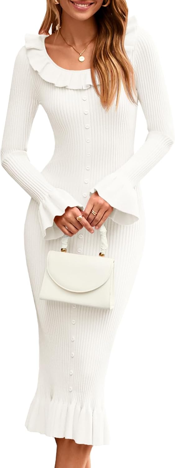 Womens Bell Long Sleeve Sweater Dress Casual Ribbed Knit Ruffle Crewneck Decor Button Bodycon Midi Dresses